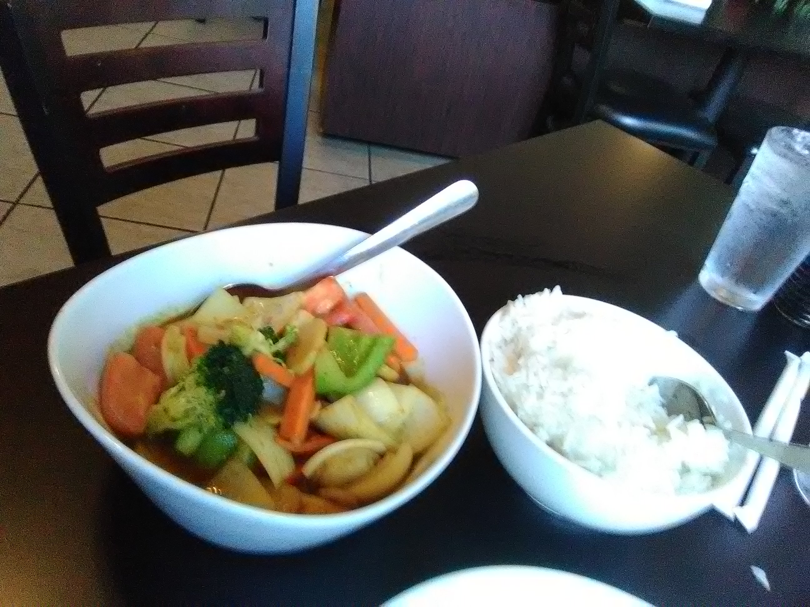 I started with a glass of Diseno Malbec, then moved on to the vegetarian Malaysian curry. If my taste buds have not yet failed me, the curry was coconut based, but strict vegans will need to call ahead to make sure. I always opt for white rice, but the much more protein-rich brown rice is an option here.