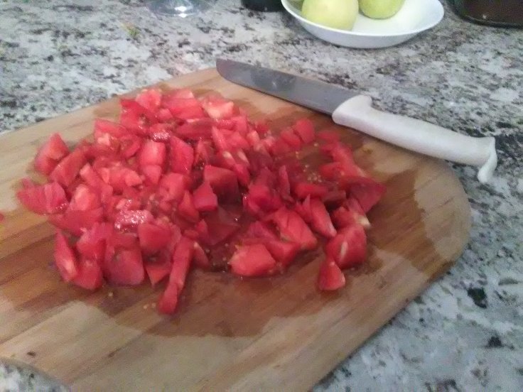 Proportions were as follows: 4 tomatoes, one small red bell pepper, one small onion, one clove elephant garlic, and 3/4 cup of Greek style yoghurt.